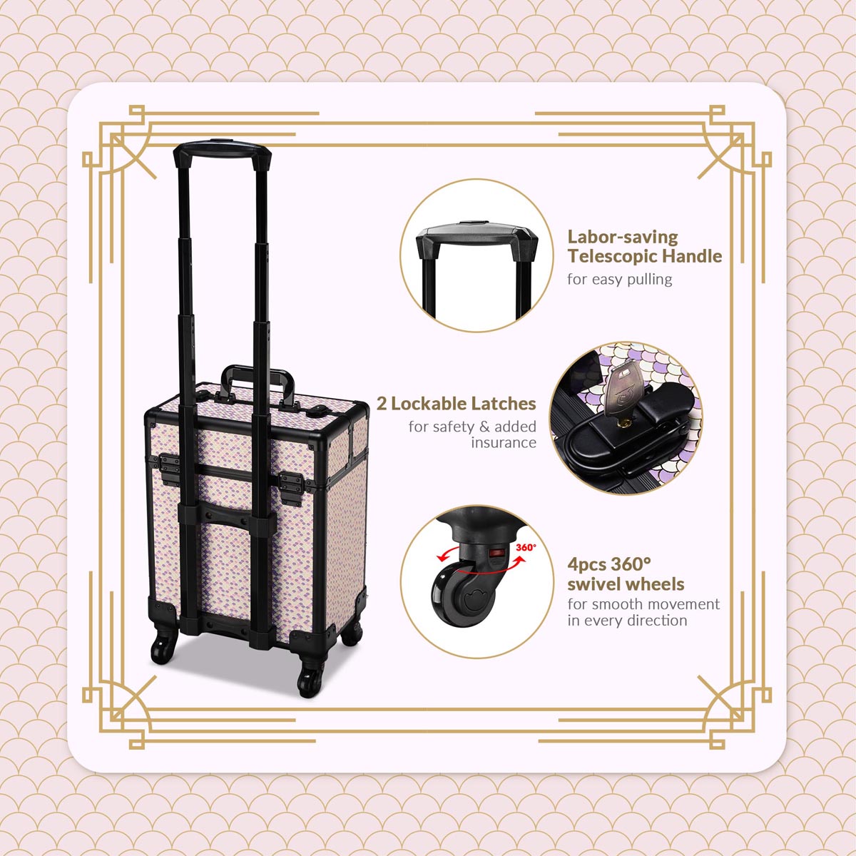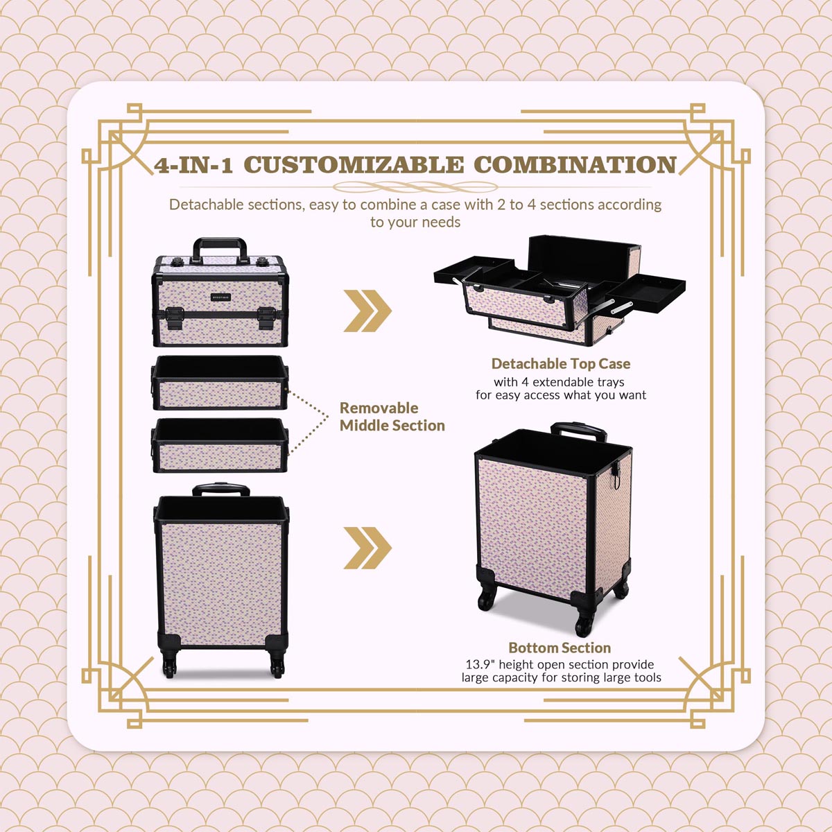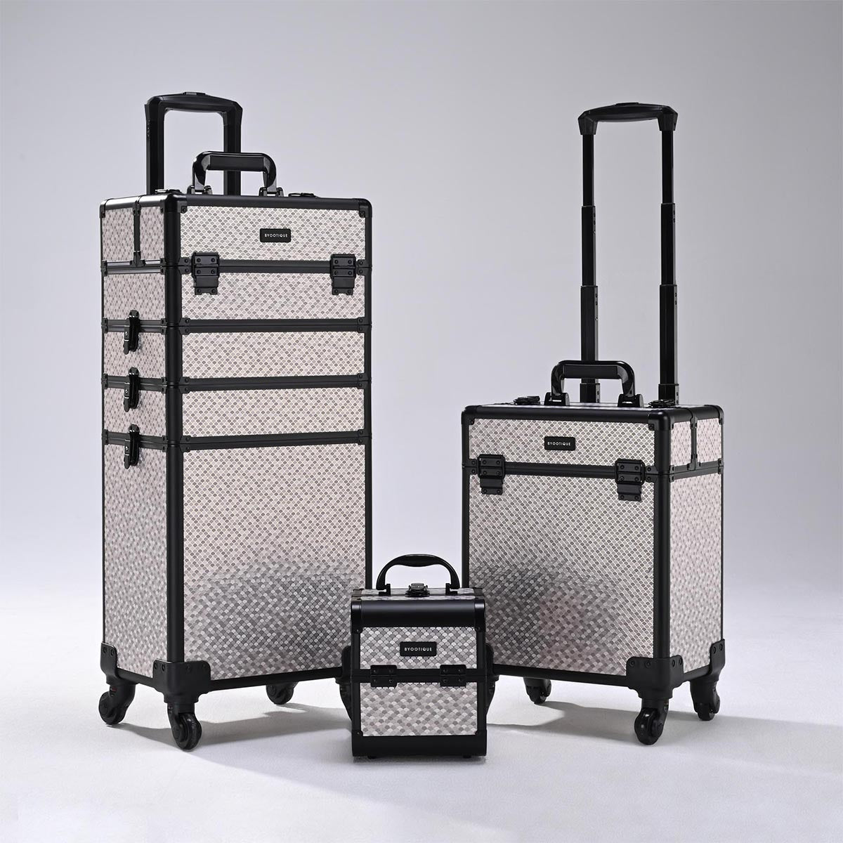 Organize your entire makeup kit with the Byootique Art Deco Makeup Case Set. This set includes an XL 4-in-1 rolling makeup case, a medium-sized Cosmetology rolling case, and a small cube makeup box. The durable ABS body and aluminum frame ensure longevity, while the smooth-rolling wheels make it easy to transport. Get ready for any event with this essential set.