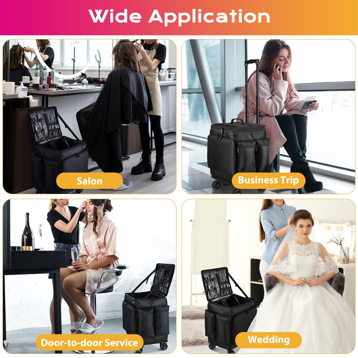 Byootique Hairstylist Travel Case is the perfect travel companion for busy professionals. Measuring 16" x 13" x 21", its large capacity design holds shears, mixing bowls, curling irons, blow dryers and other hair tools, making it suitable for hair stylists, make-up artists, and cosmetologists to use as a travel case or for in-home visits.