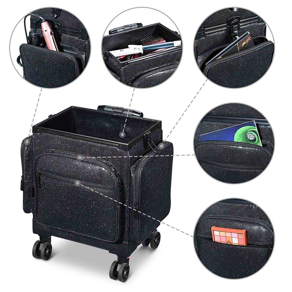 - Bottom compartment with ample space for beauty & salon tools such as hair dryers, curling irons, nail machines, etc.