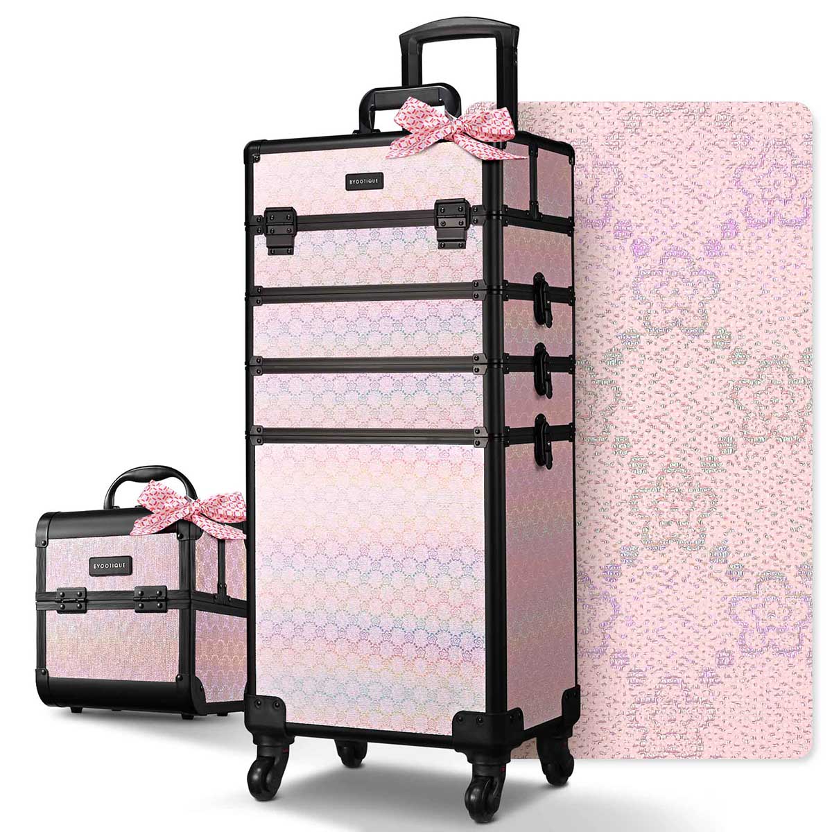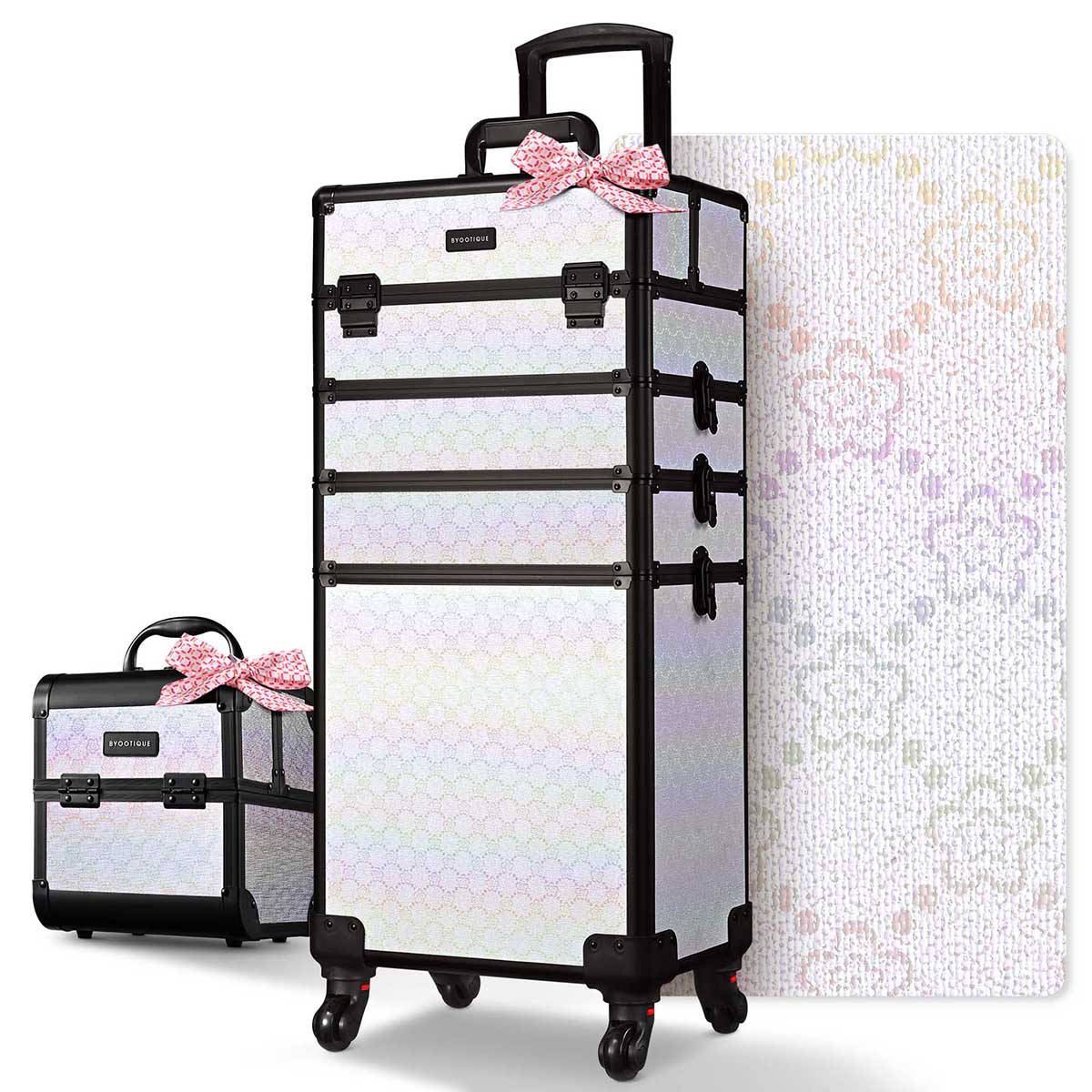 Organize your entire makeup kit with the Byootique ForgetMeNot Makeup Case Set. This set includes an XL 4-in-1 rolling makeup case, and a small cube makeup box. The durable ABS body and aluminum frame ensure longevity, while the smooth-rolling wheels make it easy to transport. Get ready for any event with this essential set.