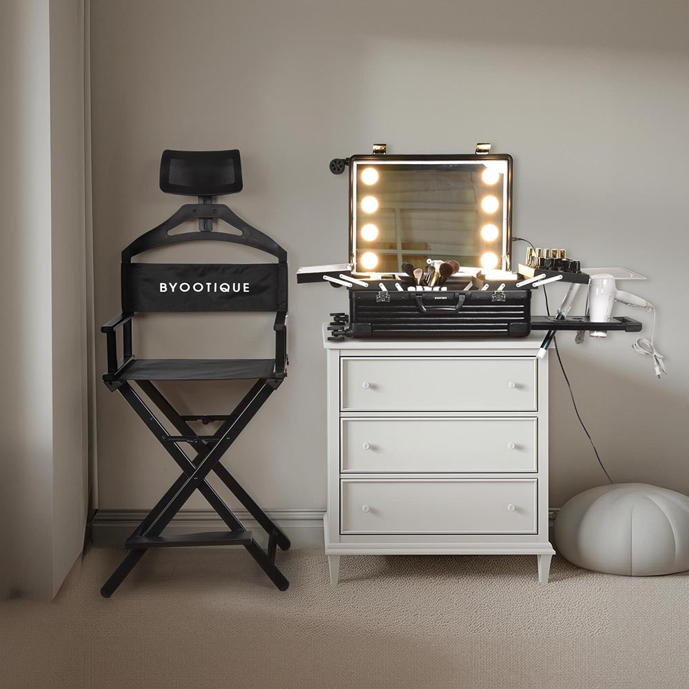 For example, the Byootique Makeup Artist Director Chair features a strong aluminium structure and an ergonomic design with a mesh curved headrest, a shoulder rest, and a non-slip footrest to ensure maximum comfort for both the artist and the client.