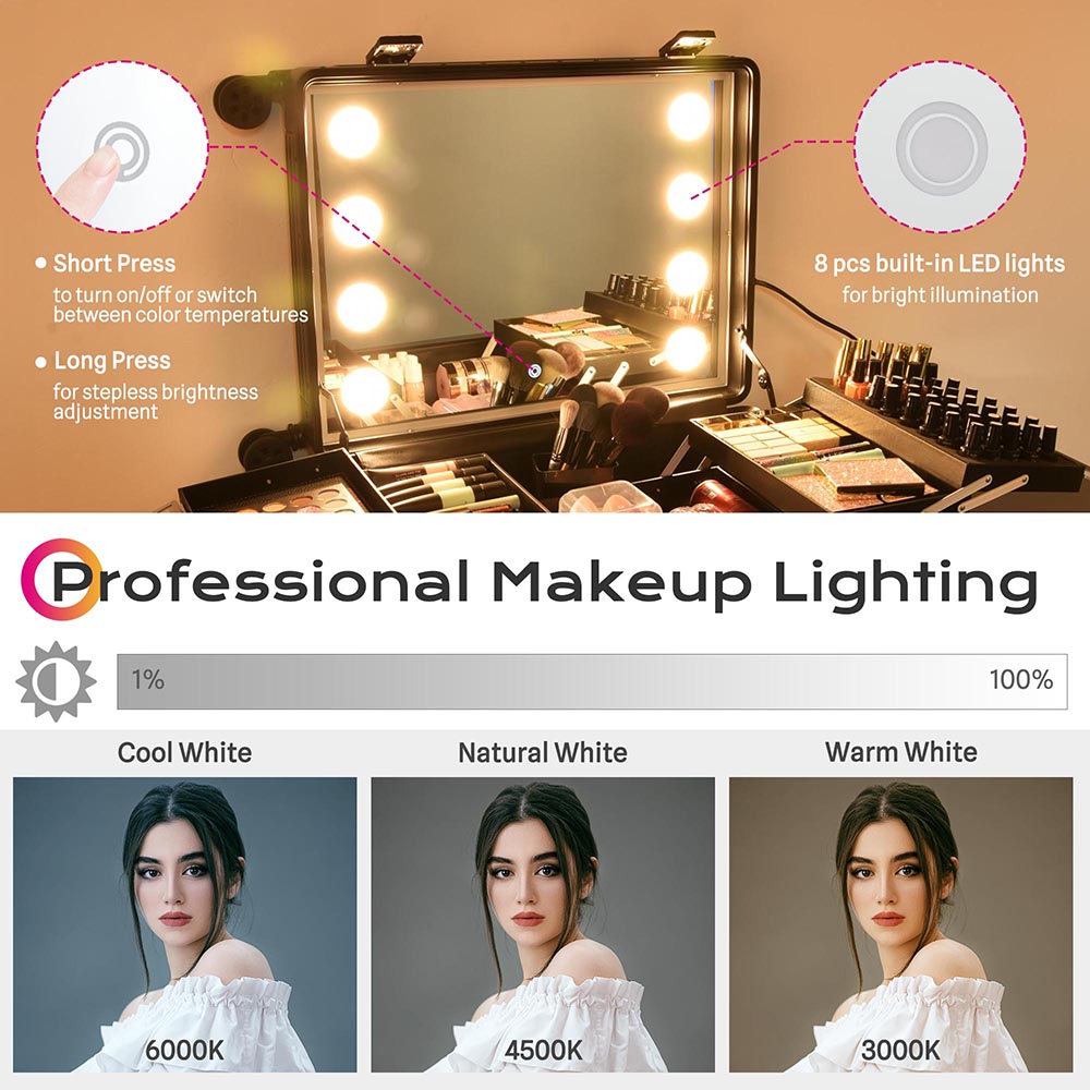 Our cases are equipped with integrated lighting and mirrors, which cater to the needs of professional makeup artists, hairstylists, and discerning individuals seeking a refined solution for organizing and transporting their beauty essentials.