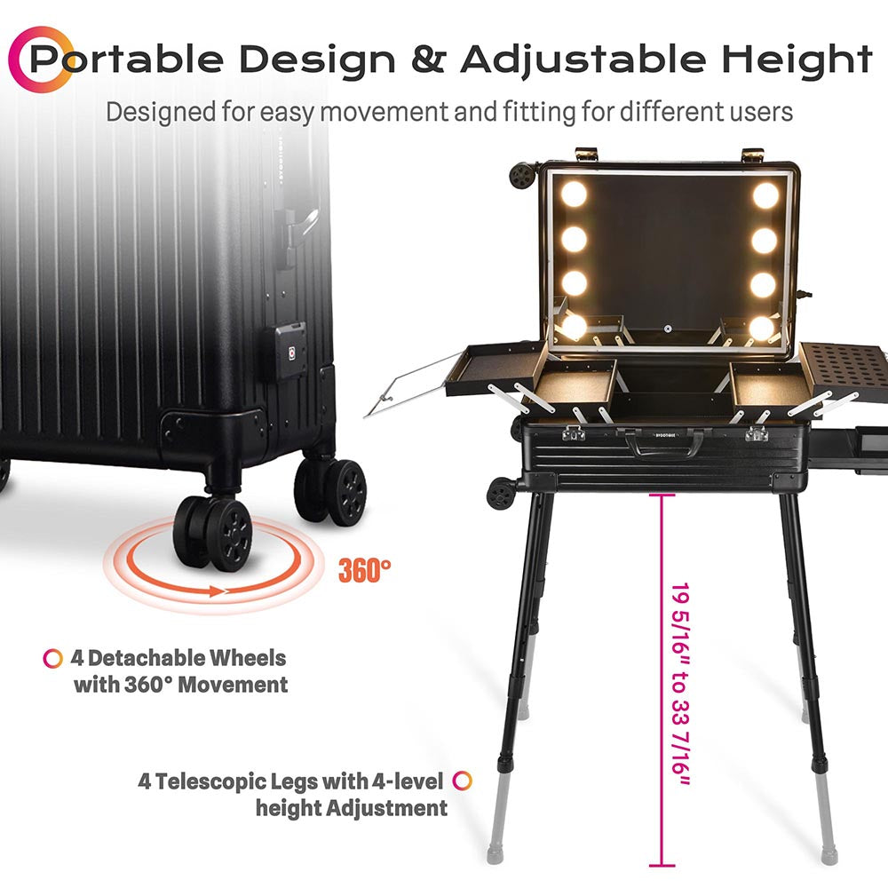 Furthermore, four removable and telescopic legs transform the case into a versatile makeup workstation with 4 levels of height adjustment, making it ideal for on-location work at weddings, film productions, events, and live broadcasts.
