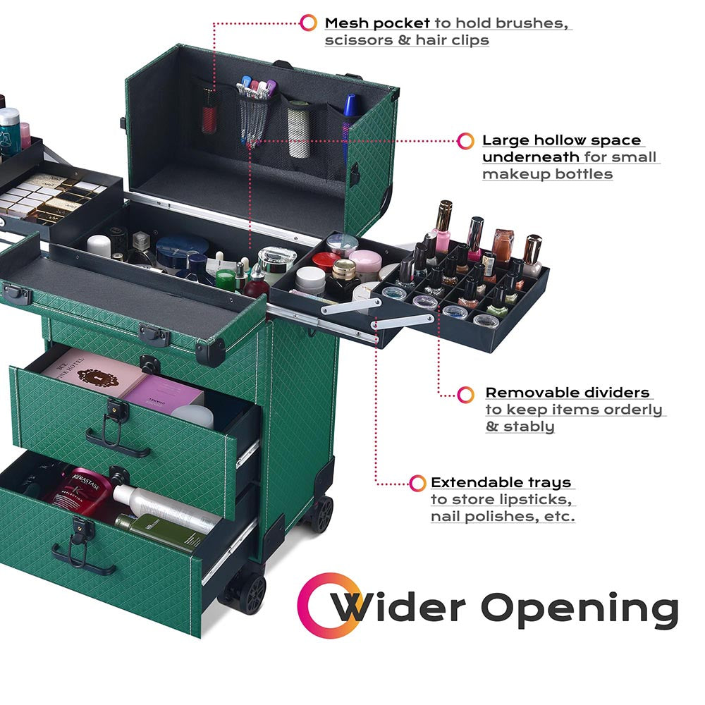 - Makeup Case with top section featuring 4 extendable trays, 2 trays on the top with removable dividers for mascara, nail polishes, etc.