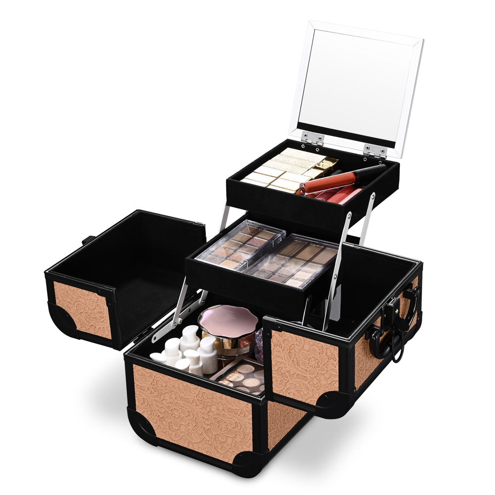 - Cube Makeup Case with flip-up mirror, 2 expandable trays & bottom space for makeup essentials. Compact size with large capacity. Perfect for traveling or home use, keep your cosmetics in one convenient place. Say goodbye to a cluttered dresser.